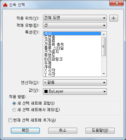 현재 선택 세트에 추가를 선택한 경우 필터링 기준을 전체 도면에 적용합니다.