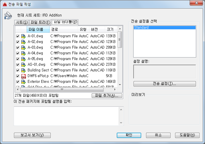 기본적으로 현재 도면과 연관된 모든 파일(예: 관련된 외부 참조, 플롯 스타일 및 글꼴)이 나열됩니다. 전송 패키지에 파일을 추가하거나 기존 파일을 제거할 수 있습니다. URL로 참조된 관련 파일은 전송 패키지에 포함되지 않습니다.