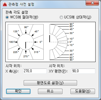 뷰 방향을 표준 좌표계(WCS) 또는 사용자 좌표계(UCS)를 기준으로 설정합니다.