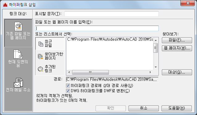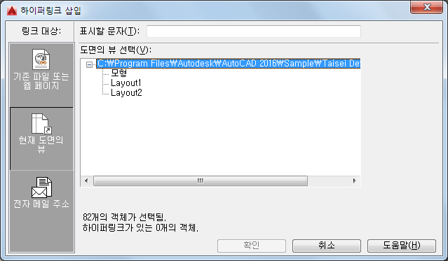 현재 도면의 뷰 탭(하이퍼링크 삽입 대화상자)