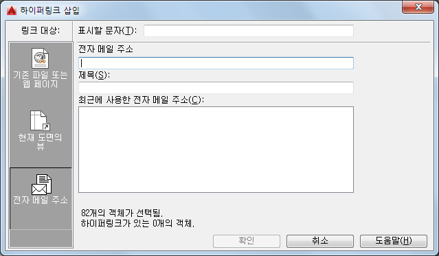 최근에 사용했던 전자 메일 주소를 나열하여 하이퍼링크에 사용할 주소를 선택할 수 있습니다.