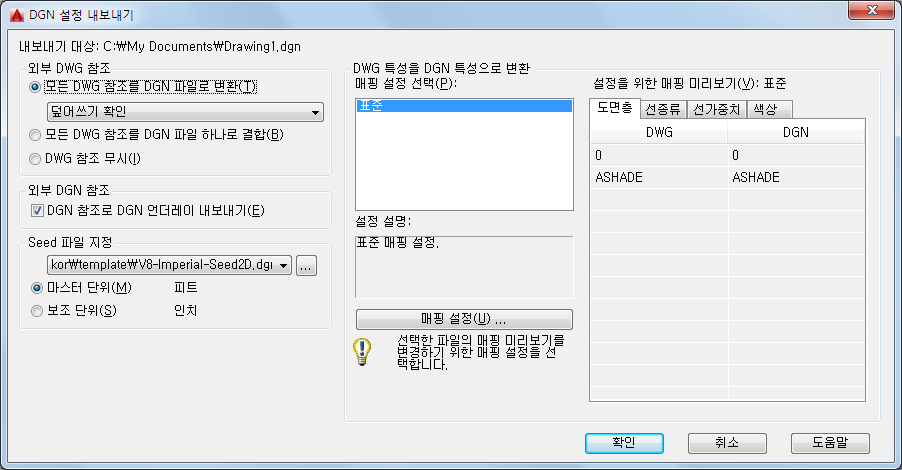 표준은 내보낼 도면에서 데이터를 추출하고, 매핑 미리보기에 표시된 대로 DGN 도면층, 선종류, 선가중치, 색상에 자동 매핑을 적용하는 기본 매핑 설정입니다.