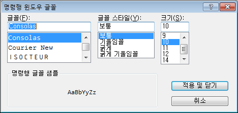 명령 윈도우에서 사용되는 문자 글꼴을 기본 설정에 맞게 변경할 수 있습니다.
