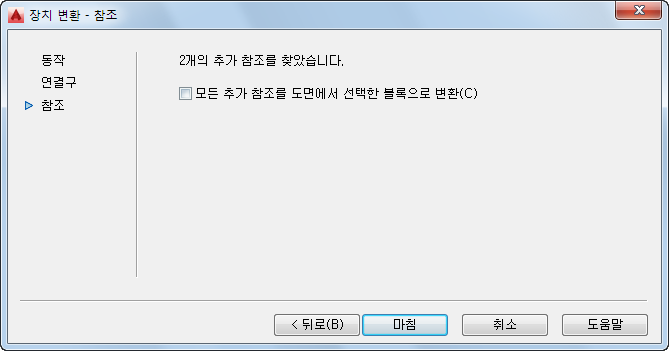 현재 도면이나 참조된 도면(외부 참조) 중 하나에서 블록이나 부품을 선택할 수 있습니다.