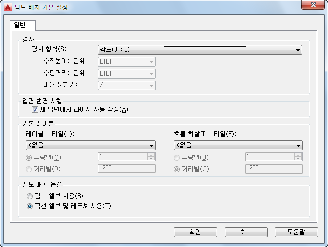 덕트 배치 기본 설정 대화상자의 일반 탭에서는 경사, 입면, 레이블, 흐름 화살표 및 엘보 기본 설정의 덕트 배치 기본 설정을 제어합니다.