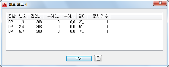 전기 설계 일람표를 작성할 때는 도면의 특정 회로에 대한 정보를 확인하는 것이 도움이 될 수 있습니다. 회로 보고서에서는 하나 이상의 선택한 회로에 대해 지정된 전반 이름, 회로 이름, 전압, 부하(VA), 회로 길이 및 장치 수를 확인할 수 있습니다.