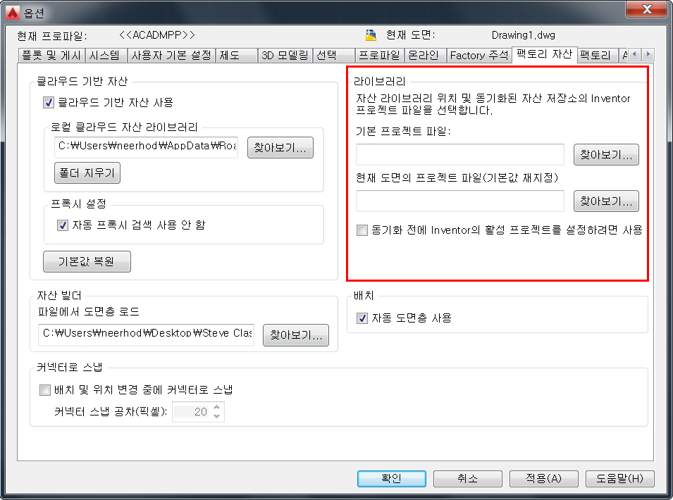 AutoCAD와 Inventor 간에 자산 라이브러리를 공유하려면 AutoCAD와 Inventor 간에 자산 데이터를 동기화하고 자산을 찾을 때 참조할 Inventor 프로젝트 파일을 AutoCAD 옵션 설정에서 지정해야 합니다.