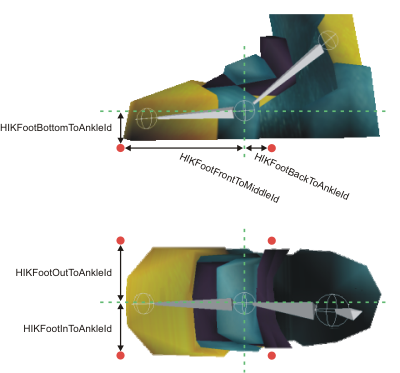 이러한 마커는 두 개의 평면을 정의하는데, 하나는 발바닥 또는 손바닥이며, 다른 하나는 발가락 또는 손가락입니다. 이러한 평면은 발가락이나 손가락 밑(위 이미지에서 가운데 마커의 위치)에서 힌지가 달려 필요한 경우 HumanIK에서 발을 구부릴 수 있도록 합니다. 최상의 결과를 얻으려면 캐릭터의 발가락이나 손가락 바로 아래, 즉 발이나 손이 구부러지는 위치에 이 힌지를 배치해야 합니다. 캐릭터의 손가락 및 발가락이 HumanIK에서 제어하는 개별 관절식인 경우 발가락 및 손가락 접점 설정도 고려해야 합니다. 아래 손과 발 접점 설정을(를) 참조하십시오.