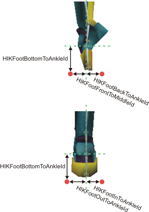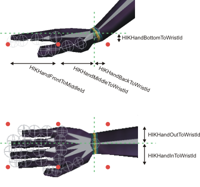 캐릭터에 HumanIK에서 제어하는 발 또는 손 관절이 없는 경우 마커의 위치가 대신 발목 및 손목 관절(LeftAnkleNodeId, RightAnkleNodeId, LeftWristNodeId 및 RightWristNodeId 노드)을 기준으로 결정되므로 이 방법이 위에서 설명한 손목/발목 접점 유형과 기능적으로 같게 됩니다.
