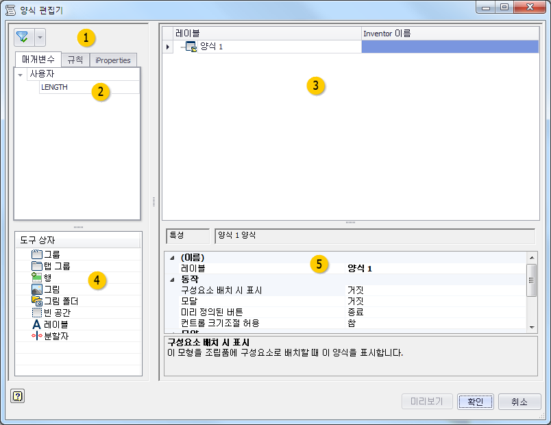 특성양식 설계 트리에서 강조 표시된 항목의 특성을 정의합니다. 특성은 선택한 항목에 따라 달라집니다.