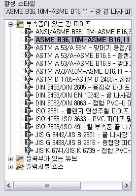 튜브 및 파이프 스타일 대화상자를 처음 열 때 검색기 리스트는 활성 스타일 위치까지 자동으로 확장됩니다. 표시된 활성 스타일은 현재 튜브 및 파이프 환경을 기반으로 합니다. 스타일 검색기 위의 읽기 전용 입력 상자에 활성 스타일이 표시됩니다. 이 활성 스타일은 검색기 리스트에서 굵게 강조 표시됩니다.