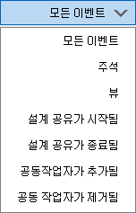이벤트 탭: 작성한 설계 공유 및 참여하도록 초대된 설계 공유의 이벤트를 표시합니다.