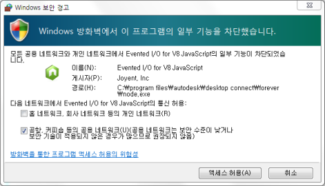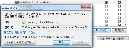 해결 방법: 방화벽 설정의 "%ProgramFiles%/Autodesk/Desktop Connect/forever/node.exe"에서 기존의 항목을 제거하고 Inventor를 다시 시작합니다. 메시지가 표시되면 Windows 보안 경고 대화상자에서 액세스 허용을 클릭합니다.
