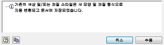재질이 재질 스타일에서 재질로 변환됩니다. 이 작업을 연기할 수는 없습니다. 추가한 사용자 재질이 변환됩니다. 새 재질 검색기 및 재질 편집기를 사용하여 기존 재질을 수정하거나 새 재질을 작성합니다.