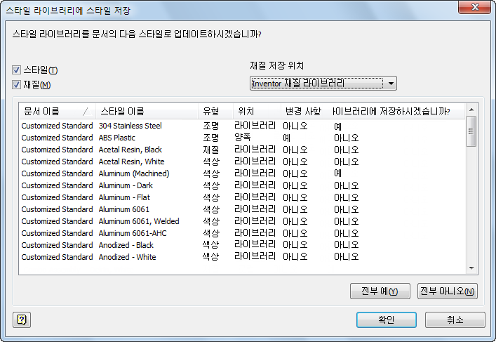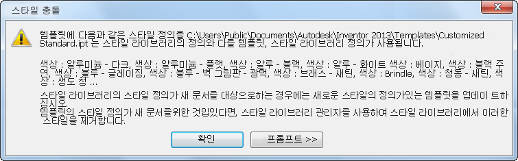 이 경고를 표시하지 않으려면 Inventor 제품 지원 블로그, Being inventive에 게시된 스타일 충돌 메시지가를 참고하십시오.