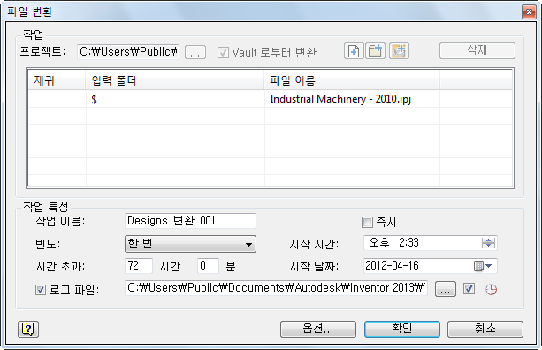 이전 파일을 수동으로 체크 아웃하고 저장한 다음 Vault에 체크 인하여 변환합니다. 또는 작업 스케쥴러를 사용하여 자동으로 변환할 수 있습니다. 다음 섹션에서는 작업 스케쥴러를 사용하여 Vault에서 파일을 새 릴리즈의 Inventor로 변환하는 방법에 대해 설명합니다.