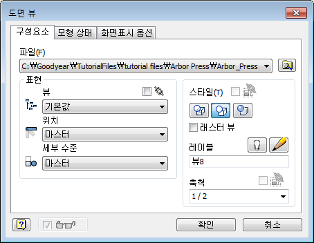 기준 뷰 및 투영된 뷰를 작성할 때는 임시 축척 값을 사용하여 시트에 모형 뷰를 맞춥니다. 기준 뷰의 구석을 끌어 그래픽 창에서 뷰 축척을 직접 변경합니다.