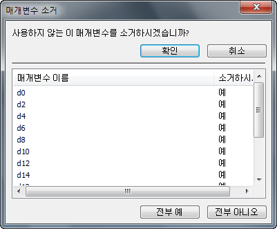 매개변수 대화상자 맨 아래에 있는 사용하지 않은 항목 소거 옵션은 별도의 창에 사용하지 않은 모든 매개변수를 나열합니다. 여기서 한 번에 사용하지 않은 모든 매개변수를 소거할 수 있습니다. 전부 예를 클릭하여 문서에서 사용되지 않는 모든 매개변수를 삭제하거나 전부 아니오를 클릭하여 현재 문서에 사용되지 않는 매개변수를 유지합니다.