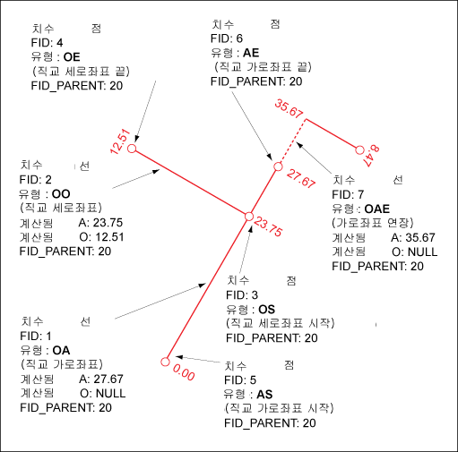 직교 치수기입은 다음 표에 표시된 대로 점과 선으로 구성되어 있습니다.