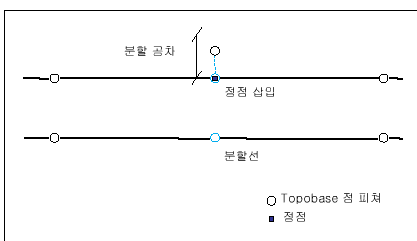 선택적으로 삽입점에서 선을 분할할 수 있습니다. 기존 선 피쳐가 삭제되고 두 개의 새로운 선 피쳐가 대신 생성됩니다. 선을 분할할 것인지 여부는 응용프로그램 옵션에서 지정할 수 있습니다.