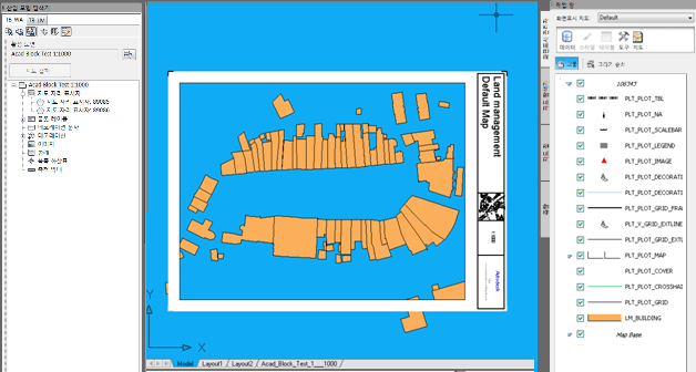- 토지 관리 데모 덤프를 가져오고 산업 모형 이름을 PLOT_ACADBLOCKS로 지정했습니다. 그리고 해당 산업 모형에 대한 플롯 확장을 활성화했습니다.