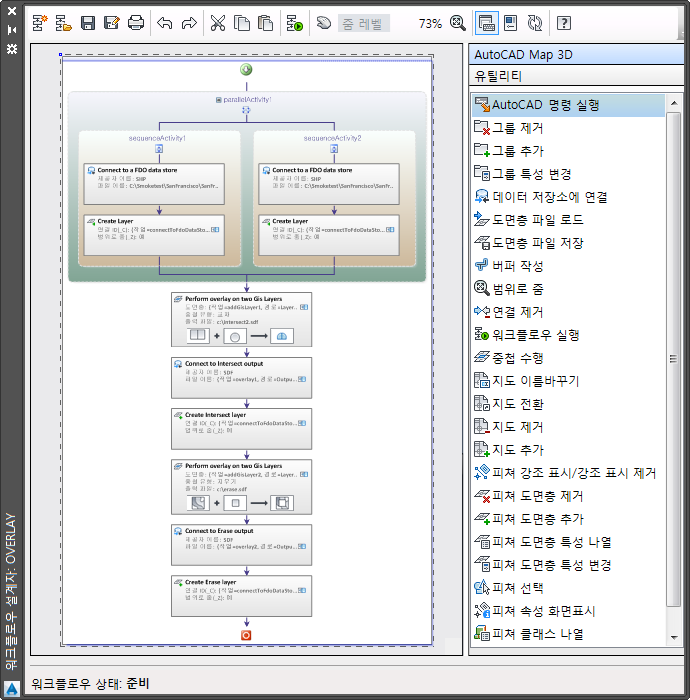 워크플로우 드롭다운 리스트에 기본 제공 워크플로우가 없다면 해당 리스트의 파일에서 워크플로우 열기를 클릭하고 Program Files₩Autodesk₩AutoCAD Map 3D 2016₩Sample₩Workflow 폴더로 이동합니다. 열려는 워크플로우의 .xoml 파일을 선택합니다.