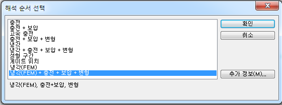 이 작업에서는 해석 순서를 냉각(FEM) + 충전 + 보압 + 변형으로 설정합니다.