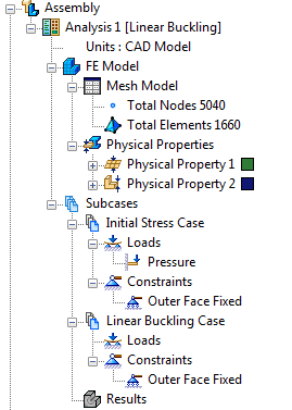 위의 그림에 표시된 것처럼 하위 사례 1(Initial Stress Case)에는 구속조건 및 하중이 있지만 하위 사례 2(Linear Buckling Case)에는 하중이 없고 동일한 구속조건이 있습니다. 이 유형의 정의는 선형 및 비선형 버클링 해석에 필요하며 기본적으로 수행됩니다.