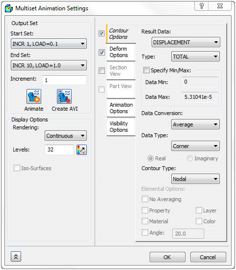 - 윤곽선 옵션: 이 섹션에서는 애니메이션 중 플롯할 결과 데이터를 선택할 수 있습니다. 최대값 및 최소값 범위뿐만 아니라 다양한 렌더링 유형을 지정할 수 있습니다.