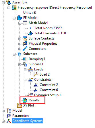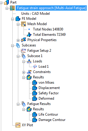 다축성 피로 해석의 경우 각 결과 세트에는 하위 사례 1에 대한 결과 및 피로 결과의 여러 가지 플롯이 자동으로 로드됩니다.