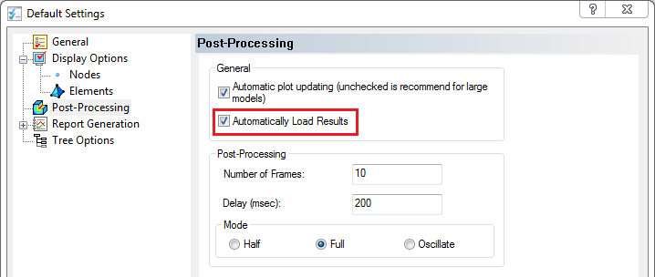 In-CAD 환경이 시작될 때 Nastran In-CAD에서 이전에 해석된 모델의 결과를 자동으로 로드합니다. 이 옵션을 사용하려면 아래 그림에 표시된 것처럼 기본 설정 대화상자에서 자동으로 결과 로드 상자를 선택합니다. 그러면 In-CAD 환경을 시작할 때 사용 가능한 결과가 모델 파일이 있는 폴더에 로드됩니다.