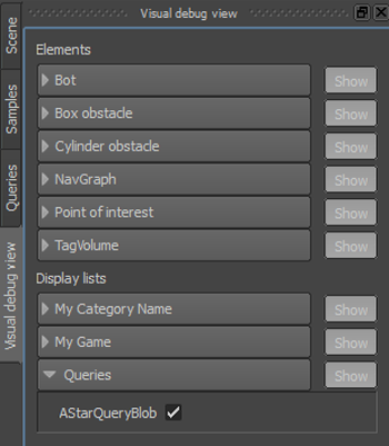 }Navigation Lab이 게임의 프레임에 대한 데이터를 표시할 때마다 Visual debug 패널의 Display lists 제목 아래에, 해당 프레임에 대해 유효한 모든 표시 목록이 표시 목록에 제공한 범주 이름에 따라 구성되어 나열됩니다. 이러한 컨트롤을 사용하여 3D 보기에서 각 표시 목록의 가시성을 토글할 수 있습니다.