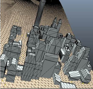 효율성과 정확성 사이에서 최상의 절충안을 얻으려면 heightfields를 사용하여 벌판과 같이 넓게 펼쳐진 영역을 나타내고 삼각형 메시를 사용하여 도시 블록과 같이 보다 많은 정확성이 필요한 영역을 나타냅니다. 예를 들면 다음과 같습니다.