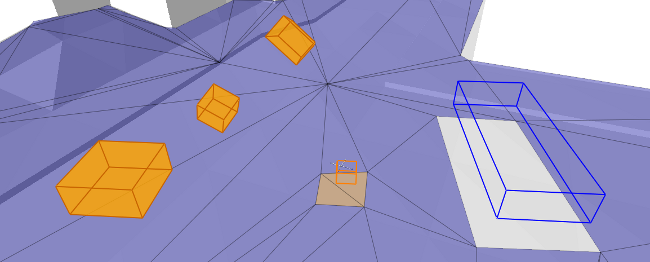 예를 들어 왼쪽의 오렌지색 상자는 이동하고 자유롭게 회전하므로 동적 회피에서만 고려됩니다. 다른 상자는 정지되어 있으므로 NavMesh에 통합됩니다. 회색 영역의 상자에는 배타적으로 설정된 NavTag가 있고, 갈색 영역의 상자에는 사용자 정의 데이터 값이 있는 NavTag가 있습니다.