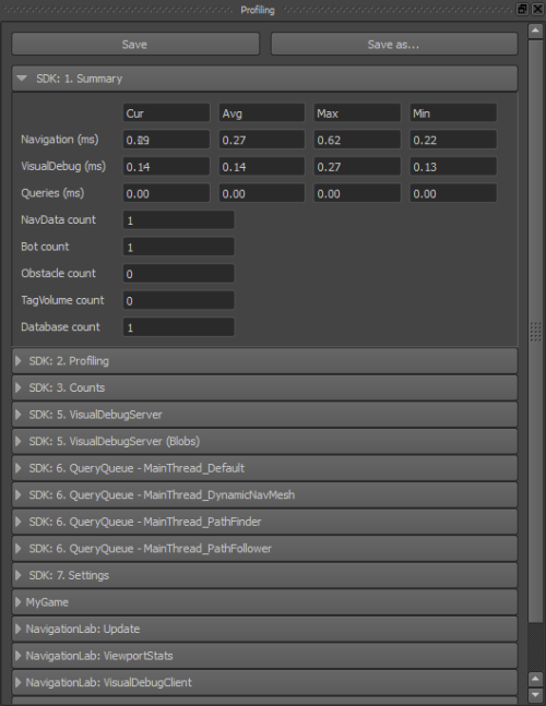 NavData가 게임에 제대로 로드되었는지 확인하려면 Profiling 패널을 엽니다. Summary 그룹에서 NavData count 값이 0보다 커야 합니다. 위의 코드 예에서 본 것처럼 DefaultFileLoader를 사용하여 NavData를 메모리로 로드한 경우 Memory Footprint 값도 데이터의 크기를 포함하게 됩니다.