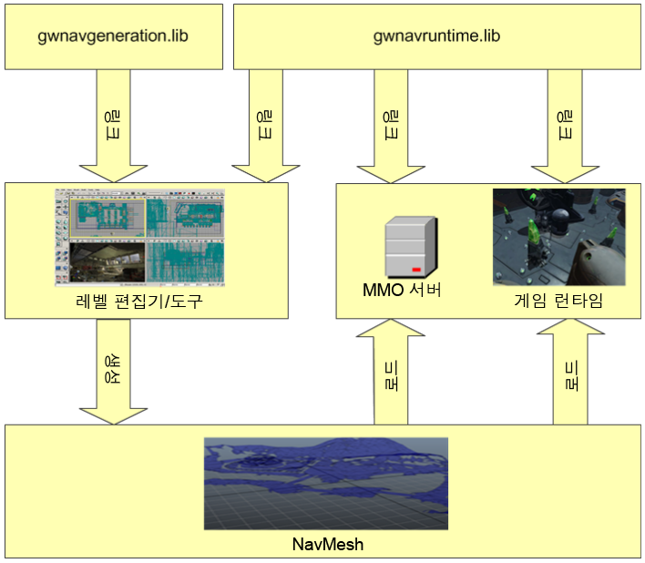출력 파일을 사용하는 대신, NavData를 원시 데이터 버퍼로 가져와 사용자 레벨의 다른 데이터와 함께 패키징하여 런타임 게임의 메모리 내/외부로 데이터를 스트리밍하는 프로세스를 삭제할 수 있습니다. 통합 단계 6a: 자산 파이프라인으로 NavData 통합을(를) 참조하십시오.