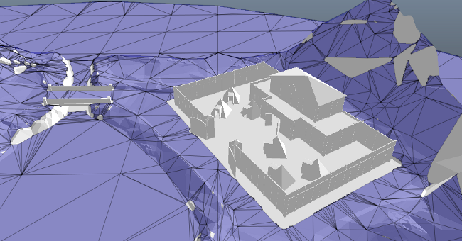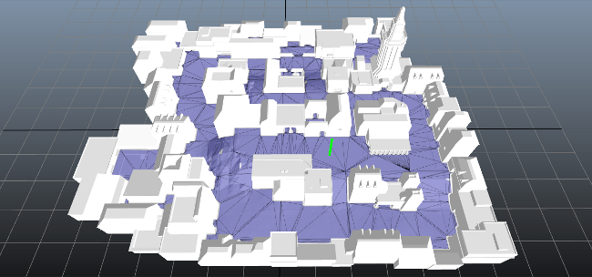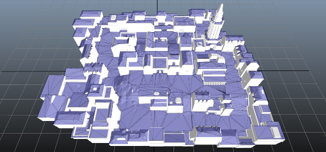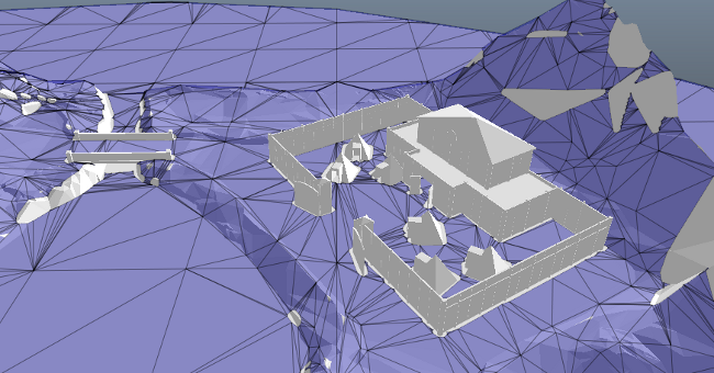 예를 들어 다음과 같은 지세를 가정해 보십시오. 기본적으로 NavData의 격리된 영역이 모든 지붕 꼭대기와 각 건물 내에 만들어집니다. 내부 NavData는 이미지에 표시되지 않지만 런타임 시 많은 추가 메모리를 사용합니다.