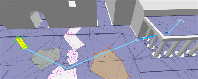 예를 들어 아래 이미지에서 노란색 봇은 지붕 꼭대기에 있는 대상에 대한 경로를 계획했습니다. 경로는 지면의 NavMesh를 통과하고 지면을 지붕 꼭대기에 연결하는 NavGraph 가장자리를 따라 이동한 다음 지붕 꼭대기에서 NavGraph 가장자리 끝에서 대상까지 연결하는 최종 세그먼트를 갖게 됩니다.