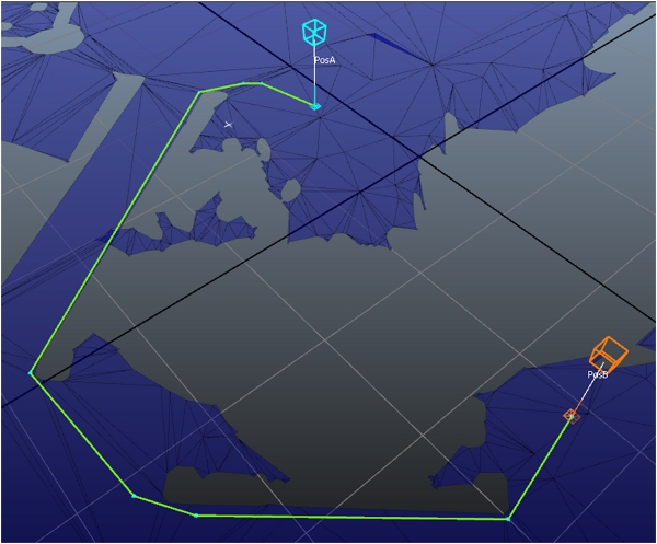 이제 게임에 연결할 때 쿼리로 계산된 경로가 3D 보기에 그려져 표시됩니다. NavMesh가 같고 A 및 B 마커에 대해 동일한 위치를 사용한다고 가정하면 결과로 나타나는 경로는 Navigation Lab에서 처음으로 쿼리를 실행했을 때 표시된 경로와 동일합니다.