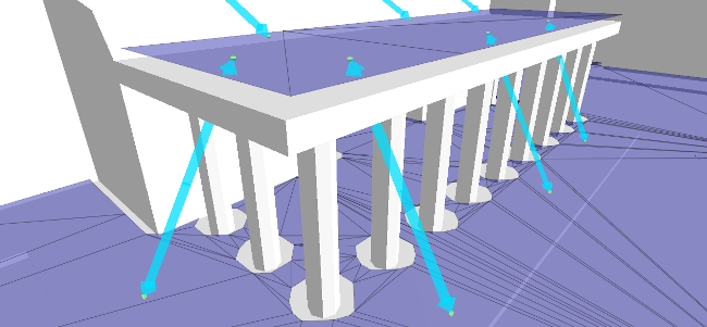 NavMesh의 삼각형은 대략적으로 지면과 같은 고도에 있습니다. 하지만 삼각형의 고도는 기본적으로 지면 고도의 근사값으로만 표시되며, 여러 층으로 이루어진 건물에서처럼 겹치는 여러 이동 가능 영역을 구분하는 데 도움이 됩니다. 일부 영역에서 NavMesh는 지면 아래를 통과할 수도 있습니다.
