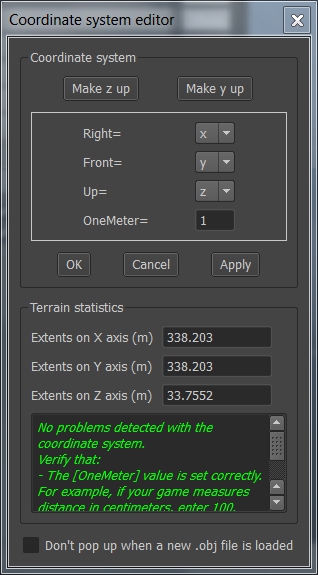 게임에 사용되는 좌표계를 설정할 수 있는 대화상자가 표시됩니다. 게임의 좌표계에서 Up, Right 및 Front 좌표에 대해 사용되는 축을 나타냅니다. 또한 OneMeter 컨트롤을 사용하여 최대 1미터를 추가하는 게임에 측정 단위 수를 설정합니다. 이는 지세가 측정되는 배율을 제어합니다.