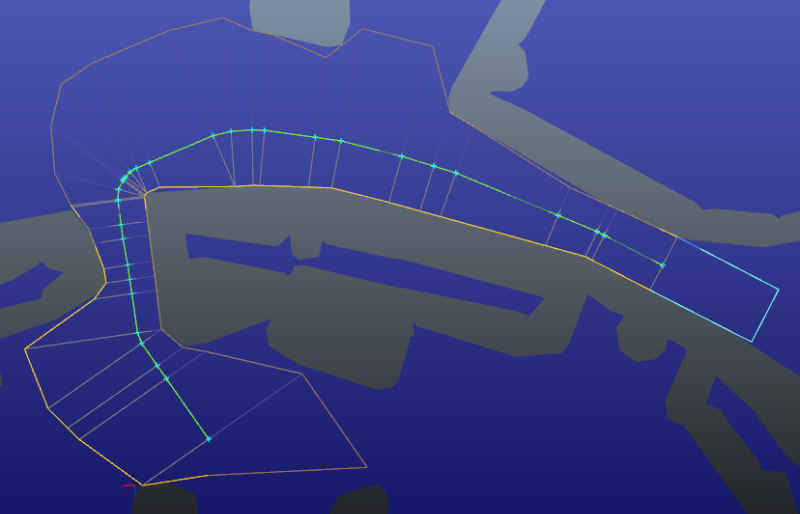 NavGraph를 통과하는 경로는 여러 채널과 연결됩니다. 유효한 채널을 갖기 위해 경로 주위에 충분한 공간(폭)을 사용할 수 없는 경우 채널이 NavMesh에서 분할됩니다. 따라서 각 NavMesh에 놓인 경로 부분에 두 개 이상의 채널이 있을 수 있습니다. 이러한 모든 채널은 경로로 집계되는 ChannelArray로 수집됩니다. 다음 그림을 참조하십시오.