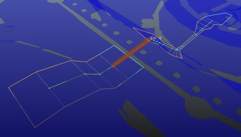 채널에는 사전 채널 단면과 사후 채널 단면이 있습니다. 사전 채널 단면 및 사후 채널 단면이 시계 반대 방향으로 열린 폴리선으로 분할됩니다. 시계 반대 방향으로 열린 폴리선이 첫 번째 게이트 또는 마지막 게이트를 사용하여 닫힙니다. 사전 채널 단면 및 사후 채널 단면은 각각 첫 번째 단면 및 마지막 단면의 연장입니다. 이러한 단면은 NavMesh 테두리에서 추출된 단순화된 폴리선이므로 사전 채널 단면 또는 사후 채널 단면의 각 위치에서 마무리 게이트의 직각 투영을 볼 수 있습니다. 다음 그림을 참조하십시오.