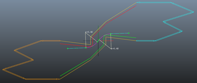 SDK에는 채널에 맞는 원-호 기반 스플라인을 유지하고 따르는 SplineTrajectory 구성요소가 함께 제공됩니다. 이 CircleArcSpline은 원 호(자홍색)와 세그먼트(녹청색)로 구성되어 있습니다. 다음 그림을 참조하십시오.