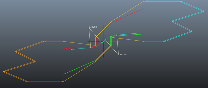 이전에는 부동 매개변수(distToBorder)를 테두리로부터의 거리 계산에 사용했습니다. channelWidth가 너무 작으면(distToBorder의 두 배 미만) 스플라인이 좁은 채널의 중간쯤을 통과하도록 이 거리가 릴랙스되었습니다. 이제 회전 안쪽에 있는 모서리와 스플라인 사이의 거리를 지정하는 구간별 연속(piecewise continuous) 아핀 함수를 channelWidth의 함수로 정의하여 이 릴랙스를 사용자 정의할 수 있습니다. 이 함수는 (0.0)에서 시작하는 폴리선으로 표현되며 여러 점을 통과하고 마지막 점 이후에는 균일해집니다 폴리선 점 [p0 - pn]을 제공하여 매개변수화됩니다. 처음 세그먼트를 (0,0)에서 p0까지 자동으로 가져오기 때문에 (0,0) 점은 제공되지 않습니다. 기본값은 단 한 점(0.4, 0.2)이 있으며 이는 기본값이 0.2인 단일 부동 distToBorder 매개변수처럼 작동합니다. channelWidth가 [0, 0.4]이면 선형 계수가 0.5인 선형이고 channelWidth가 0.4m보다 크면 0.2m로 균일해집니다