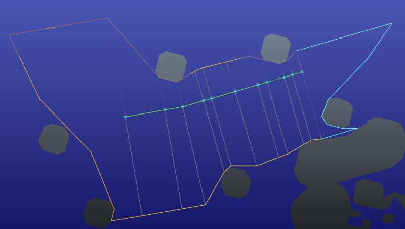 채널은 게이트의 배열입니다. 두 개의 인접한 게이트 사이의 쿼드 또는 삼각형을 채널 단면이라고 합니다. 각 섹션은 모든 NavMesh 장애물로부터 완전히 자유롭습니다. 다음 그림을 참조하십시오.