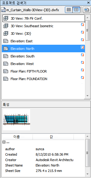 프로젝트 검색기는 현재 열려 있는 파일에 있는 모든 시트/모형을 나열하는 고정 가능한 창입니다.