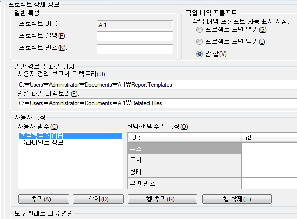 기타 일반 프로젝트 정보에는 경로, 작업 내역 프롬프트 설정, 데이터 관리자 줌 설정, 도구 팔레트 그룹 연관 등이 있습니다.
