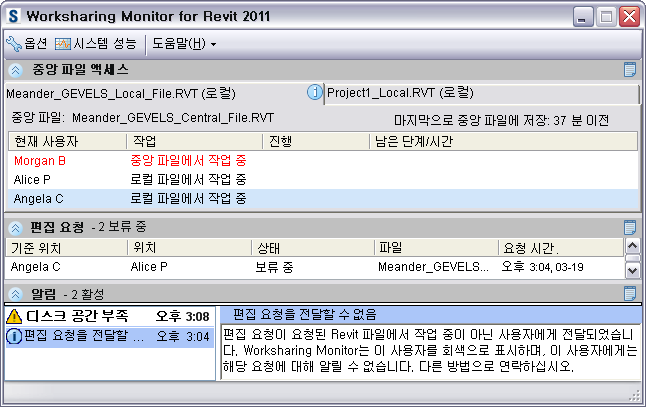 Revit작업 공유 프로젝트와 관련된 문제가 발생할 경우 바탕 화면 알림을 표시하도록 Worksharing Monitor를 구성할 수 있습니다. 바탕 화면 알림은 Windows 시스템 트레이 근처에 표시되는 메시지입니다. 표시할 바탕 화면 알림을 지정하려면 옵션 대화상자를 사용합니다. 옵션 설정을 참고하십시오.