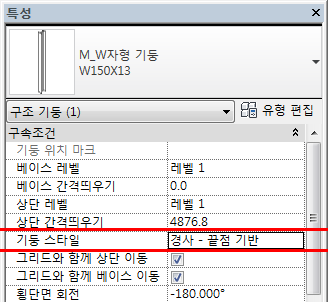기둥은 Advance Steel 모델의 각도와 상관없이 Revit에서 구조 기둥, "경사 - 끝점 기반"으로 전송됩니다.Advance Steel에서는 기둥을 기둥으로 가져오고 모델 역할을 "기둥"으로 설정했습니다.